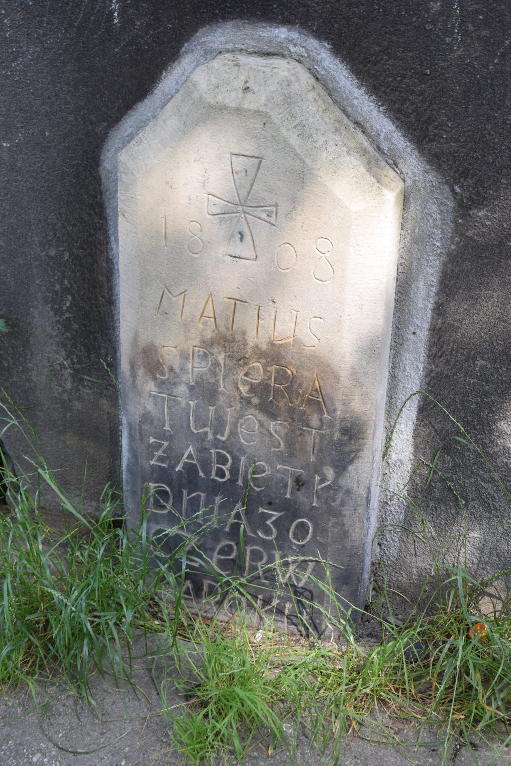Inskrypcja na kamieniu mówi: „18+08/MATHIUS/SPIERA/TU JEST ZABIETI/DNIA 30/CZERW/CA ROKU”. Prawdopodobnie chodzi o pochodzącego z Rozbarku Mateusza Spyrę. Oryginał kamienia od 1947 r. znajduje się w zbiorach Muzeum Górnośląskiego. Na ul. Piekarskiej znajduje się jego kopia. Franz Gramer (1797-1865), bytomski kronikarz wspomina o tym wydarzeniu w swojej „Kronice miasta Bytomia na Górnym Śląsku”. Do wypadku doszło w dniu 30 czerwca 1808 r. Tego dnia Maciej Spyra, członek bogatej rodziny mieszczańskiej z Rozbarku, tego wieczoru dość mocno podchmielony, szedł chwiejnym krokiem przez przedmieścia ówczesnego Bytomia, a właściwie przez szczere pole. Głośno śpiewał pruskie piosenki wojskowe, czym prawdopodobnie ściągnął na siebie nieszczęście. Napotkał francuski patrol, który pozbawił go życia. Podejrzewa się, że mord miał cel rabunkowy. Inna wersja wydarzenia mówi, że podchmielony Maciej Spyra zginął pod kołami rozpędzonego wozu z zaprzęgiem końskim, który najprawdopodobniej uciekał z miejsca rabunku. Jak dokładnie było, pewnie już się nigdy nie dowiemy. Podobno mieszkańcy miasta określali ten kamień „trupim” czy „morderczym”. Legenda mówi, że czasami około północy przy tym kamieniu można zobaczyć małą, paskudą postać, która przykuca.